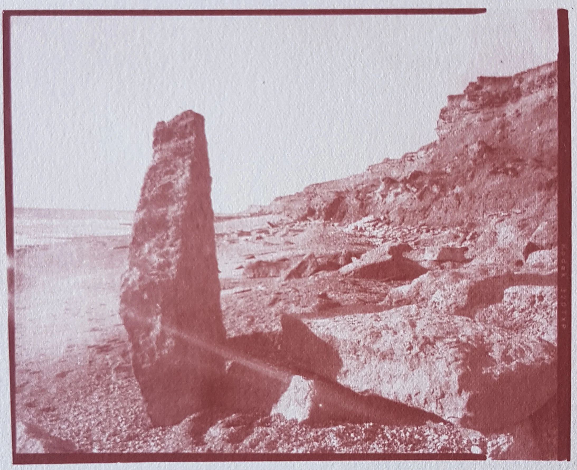 En revenant sur mes pas, je découvre qu'il est possible d'accéder à la mer par une corde attachée à un buisson trapu et solide, un ancien cordage de bateau trouvé sur place a fait l'affaire. Je descends par cette enclave et me retiens tant bien que mal, puis je finis par arriver sur les silex marins. Cet endroit est sauvage, coincé entre la falaise et la mer, qui a créé une érosion naturelle, me retrouvant aiisi face à une mémoire archéologique vivante. Des colonnes travaillées par la main du temps couchées sur le sol, la glaise humide qui garde les empreintes de pas, où quelques plantes se sont implantées par le vent, l'érosion laisse apparaître de fines couches poudrées d'une couleur chaude de terre rouge tirant vers le jaune d'ocre. Par endroit, se sont des niches naturelles que les éléments ont construit par répétition, des enclaves où nous pourrions déposer la sculpture d'un dieu tutélaire.