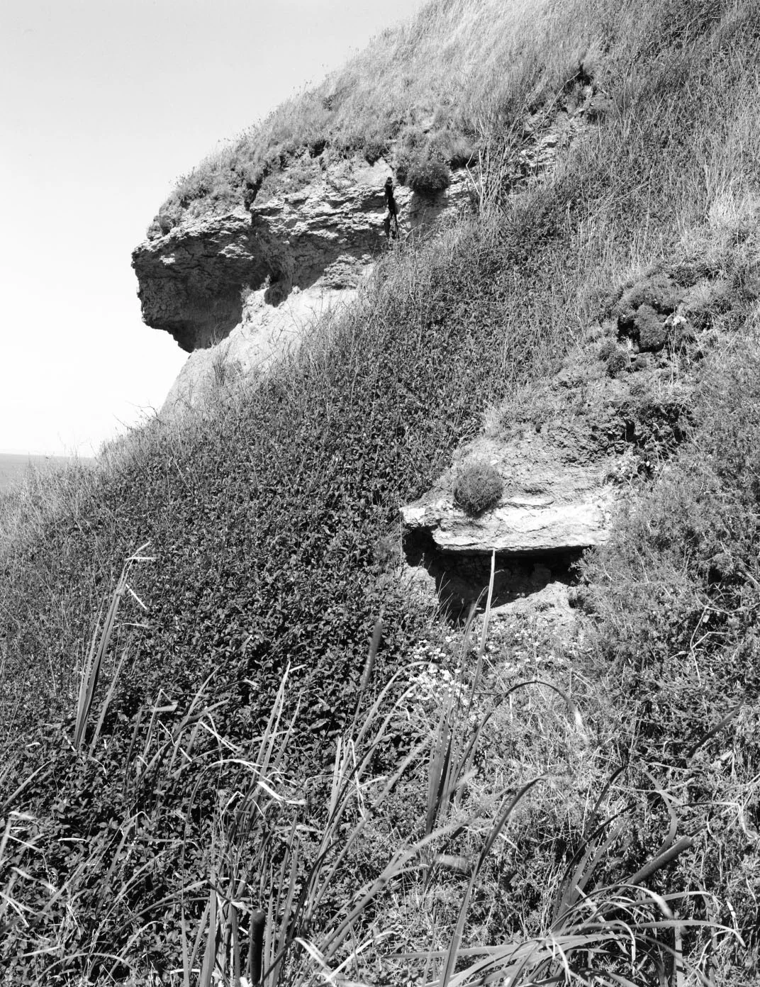 Le temps se stabilise ici-même, sa facture est présente sans l'intervention de la main humaine, comme si nous étions à bord d'un avion, ou dans la cale d'un bateau, nous ne ressentirions aucune sensation de vitesse, pourtant, c'est une métamorphose vers un effacement du temps. Dans cet espace naturel, la falaise fut creusée par la succession ininterrompue des marées, les formes sculptées répondent à l'affaiblissement de la matière minérale et prennent la consistance d'une présence organique, se matérialisant sous la forme d'un visage ou d'une partie du corps.